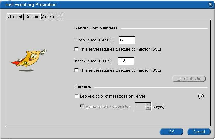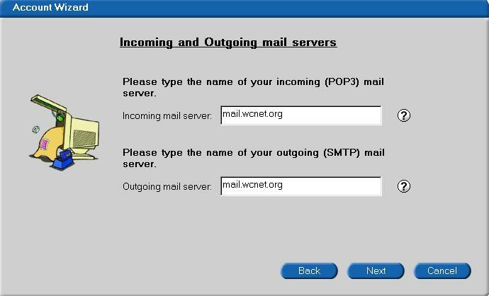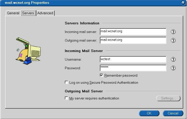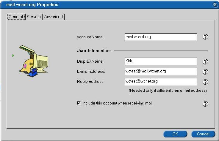 Here you have the option of putting in a reply to address. This can be the alternate address you were given when you got your WCNet account. You don't have to enter this but you can if you wish. Click on the servers tab.