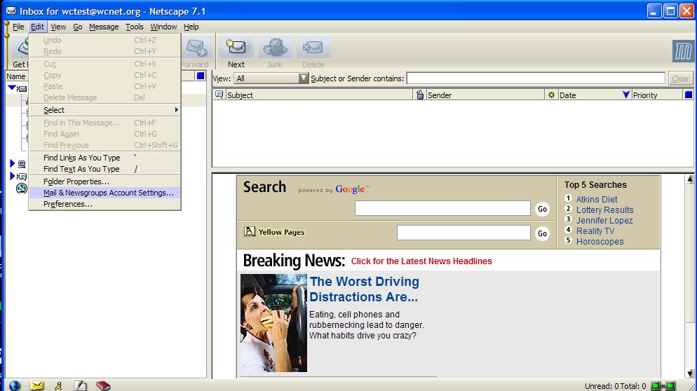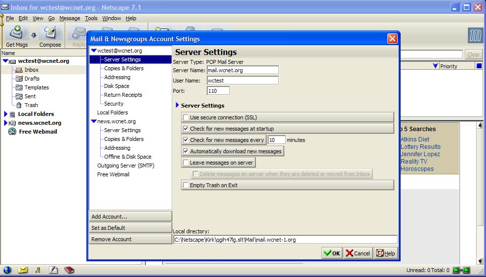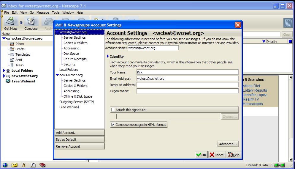 If you don't already have an e-mail account set up under Netscape7.x, the wizard will run. All you need to do is enter your e-mail address and mail.wcnet.org as both the POP3 and the SMTP servers.