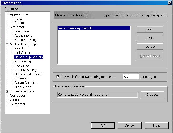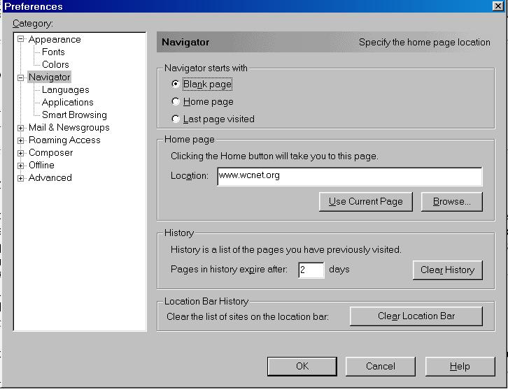 In the example, www.wcnet.org is the home page you would go to by clicking on the home button. It can also be the page that opens when you start Netscape by putting the dot in home page rather than blank page in the section above the address.