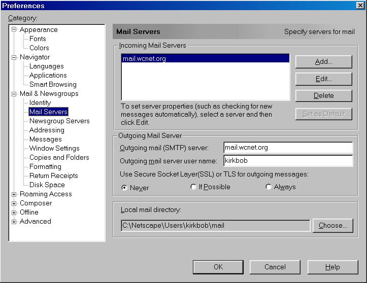 Type in mail.wcnet.org as the outgoing (SMTP) server and your login name (if it isn't in already). The rest of the choices should default correctly.