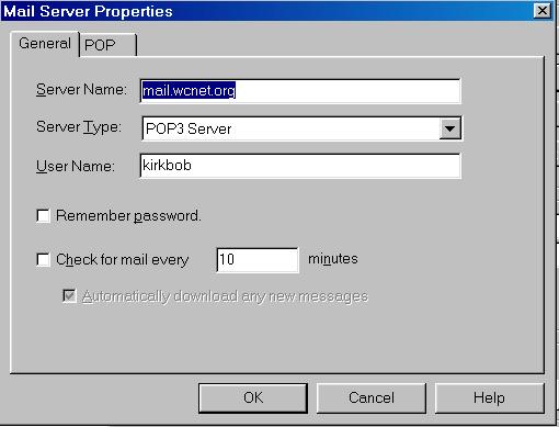 Make sure POP3 Server is selected as the server type. Type in mail.wcnet.org as the server name and then your login name. Before leaving this screen, click on the POP tab and make sure there is not a dot in leave messages on server. Click okay to this screen and you will return to the mail servers screen: