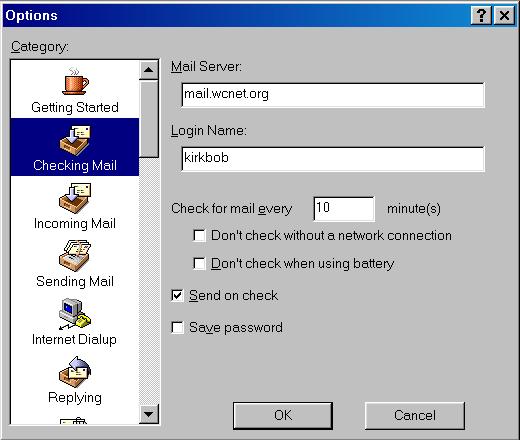 Under Special: Make nickname (This has been moved to Tools, Address Books in the latest version of Eudora. The principle is still the same). This is another way to save typing e-mail addresses. If you write to someone often, but not often enough that you want them in your recipient list, use the nickname option. You type a simple name (like Kirk) into the To: section of the mail form and Eudora will put the e-mail address associated with that nickname into the To: field when it sends the mail. Add as recipient and remove recipient are the places where you maintain your recipient list. By highlighting an e-mail address and clicking on add as recipient, that person's e-mail address will be added to your recipient list. It does just what it says. If you decide you don't want to have that person on your list, click on remove recipient and then on the person to remove. Empty trash does that. Compact mailboxes is used when your mailboxes are rather large. By clicking on this, unclaimed space in the mailboxes can be reclaimed. Change and forget passwords only change the passwords in Eudora. Clicking here will not change your password at wcnet. In fact, you only have to use these if you change your password at wcnet.