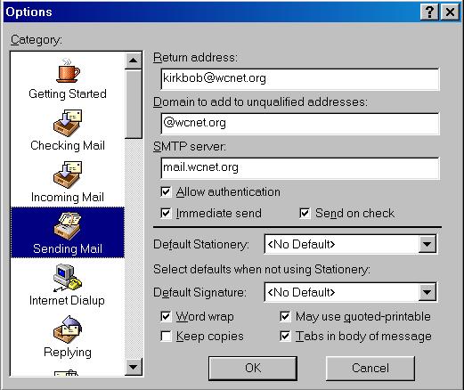 Tools: Mailboxes and Address Books are where you do mailbox and nickname maintenance. Change the order, rename, remove, add and other things can be done here. The PH section, in my experience, does not work under wcnet. If you want to append some pithy saying or important information to every message you send, use Signature. This will open a box where you can enter text that will be added to all your e-mail messages. This is the last bastion of ascii art. Options is where you add all the information used by Eudora, like pop servers, how you are to be alerted when mail comes in, etc. These are all fairly explanatory.