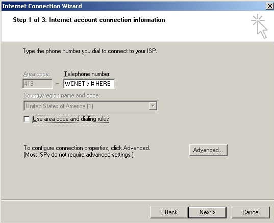 "Connection name:" you should type "WCNet 56K". Click next.