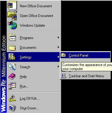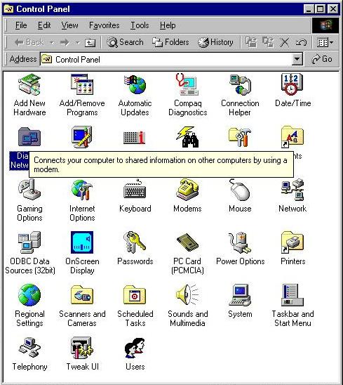 1.Go to start, then up to Settings, then right to Control Panel. Find the Dial- up Networking icon, Left click on this icon.