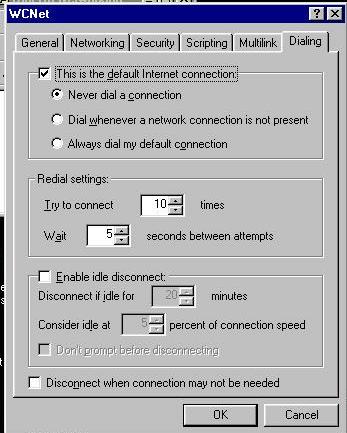 20.Click on Dialing tab. The only part we are concerned about is the redial section. Make sure there is a checkmark in redial. Set the times to try to 25. In the other sections, make sure there isn't a checkmark in either of the disconnect options. There should be a checkmark in this is the default connection and a dot in never dial a connection (you will make the connection using a shortcut to this connection icon). Click ok to accept the changes and close that window.