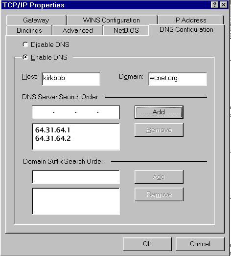 If you are unable to surf after completing the above instructions, you may need to enter the dns numbers. To do this go back to the section marked with an asterick. Click on the DNS configuration tab again and then click in the box with the three dots. Type in 64.31.64.1 and click on the add button. Click in the box with the three dots again and type in 64.31.64.2 and click the add button again. When you are done, your setup should look like this: