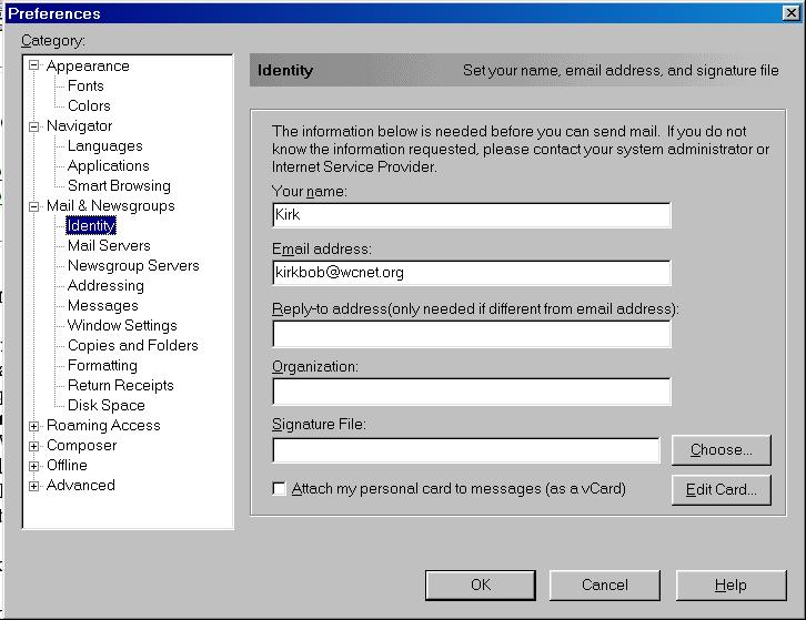 In Netscape, click on edit/preferences and then on the plus mark next to Mail&Newsgroups. Then click on identity. You should see this screen: