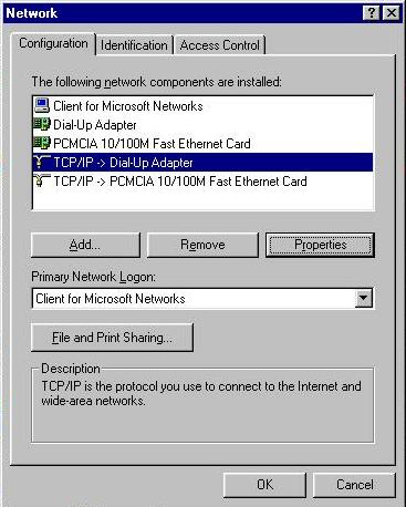 24. Make sure that Client for Microsoft Networks is one of the listed components. If it is, you'll have a tab that says identification. (If it isn't, you'll have to add it by clicking on the add button. Then click on clients, then Microsoft, then Client for Microsoft Networks.) Make sure that Client for Microsoft Networks is your primary login, not Microsoft Family Logon. In fact, you should remove MS Family Logon by clicking on it to highlight it and then clicking on the remove button. Click on TCP/IP to highlight it. (If you don't have TCP/IP, you'll have to add it by clicking on the add button and then on protocols. Click on Microsoft on the left side and TCP/IP on the right side). Once TCP/IP is highlighted, click on properties. A window with three tabs will come up.