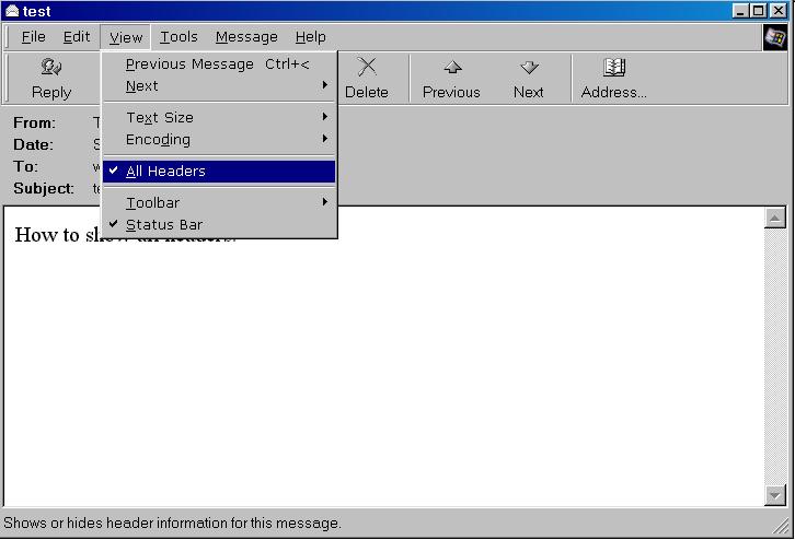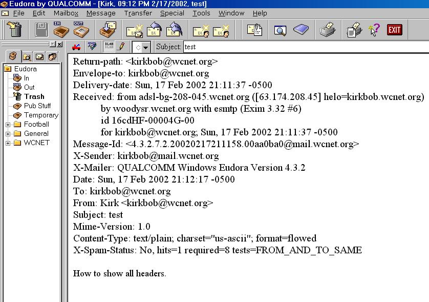 If you receive a spam message that you would like WCNet to filter out, you need to send a copy of it to us showing all headers. This way, we can trace where the message originated. Below you will see screen shots of how to show all headers using Eudora and Outlook Express. Once you have all headers clicked, forward the offending message to abuse@wcnet.org.